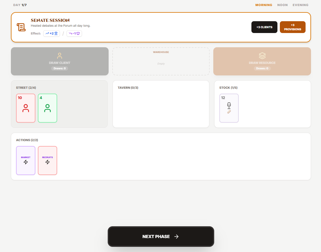 Rome, 60 AD. You have just opened your establishment in the bustling streets of the Imperial capital. In Tabernarius, you have 7 days to prove your worth as a tavern keeper and accumulate as much Prestige as possible.